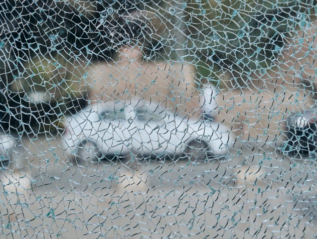 May crack under pressure, but tends to remain integral, adhering to the plastic vinyl interlayer